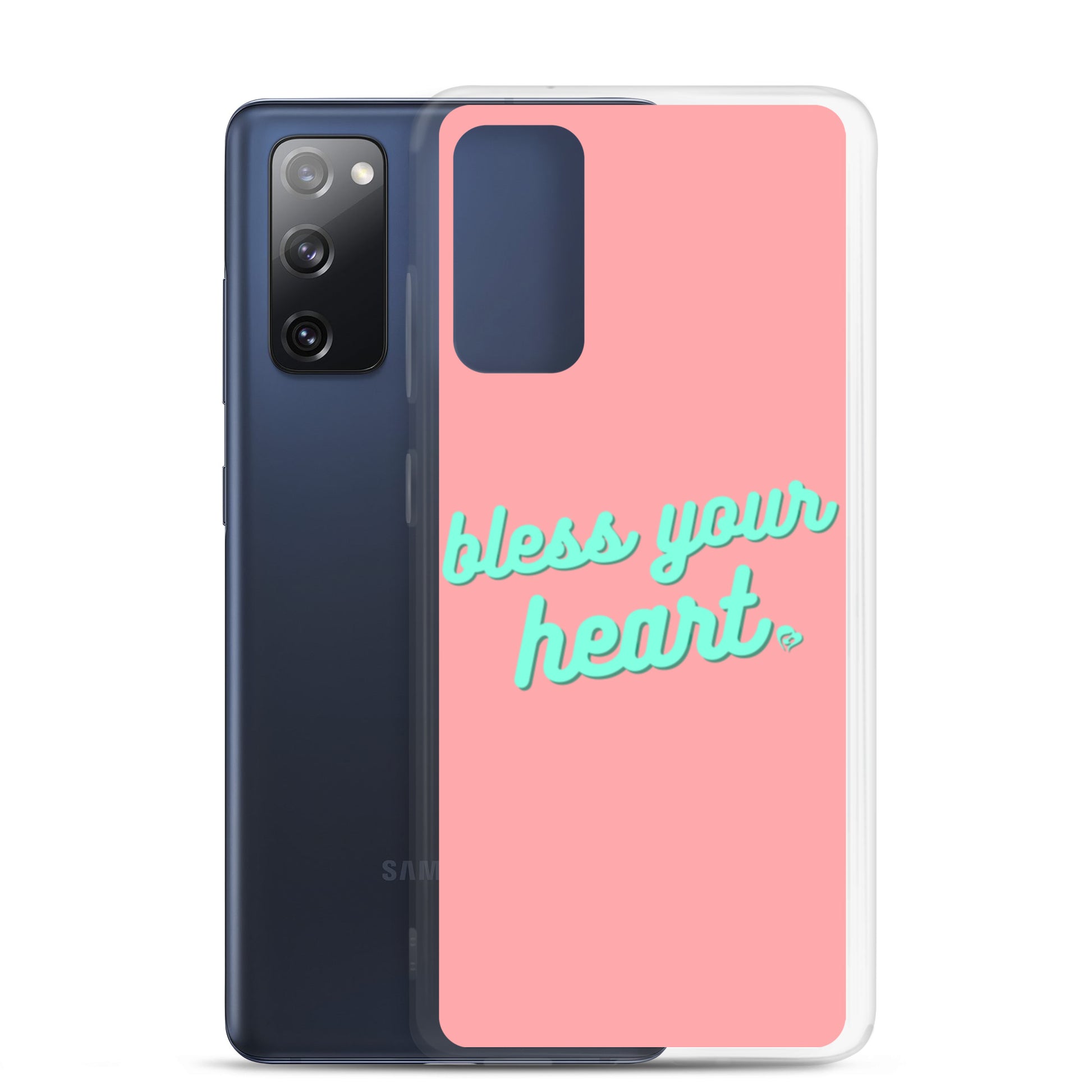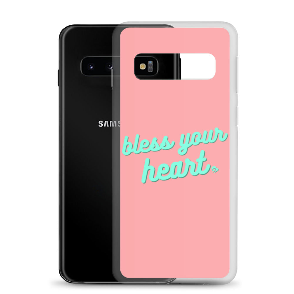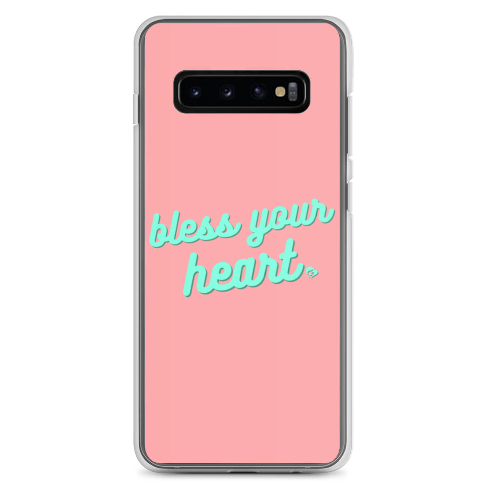 This sleek Samsung case protects your phone from scratches, dust, oil, and dirt. The bless your heart southern saying has a retro feel and really pops on the coral background. It has a solid back and flexible sides that make it easy to take on and off, with precisely aligned cuts and holes. It is a BPA-free hybrid thermoplastic polyurethane and polycarbonate material. Wireless charging capable.