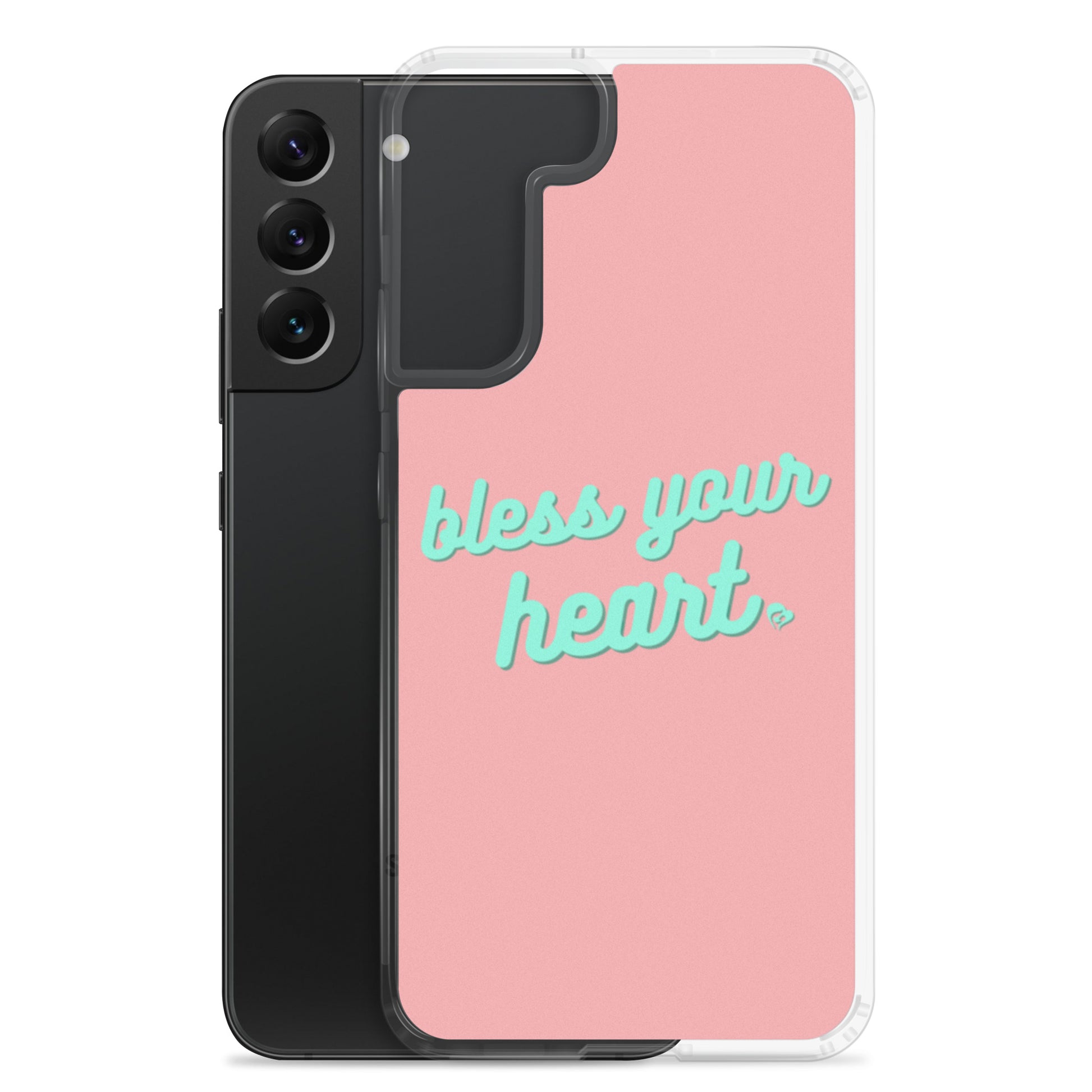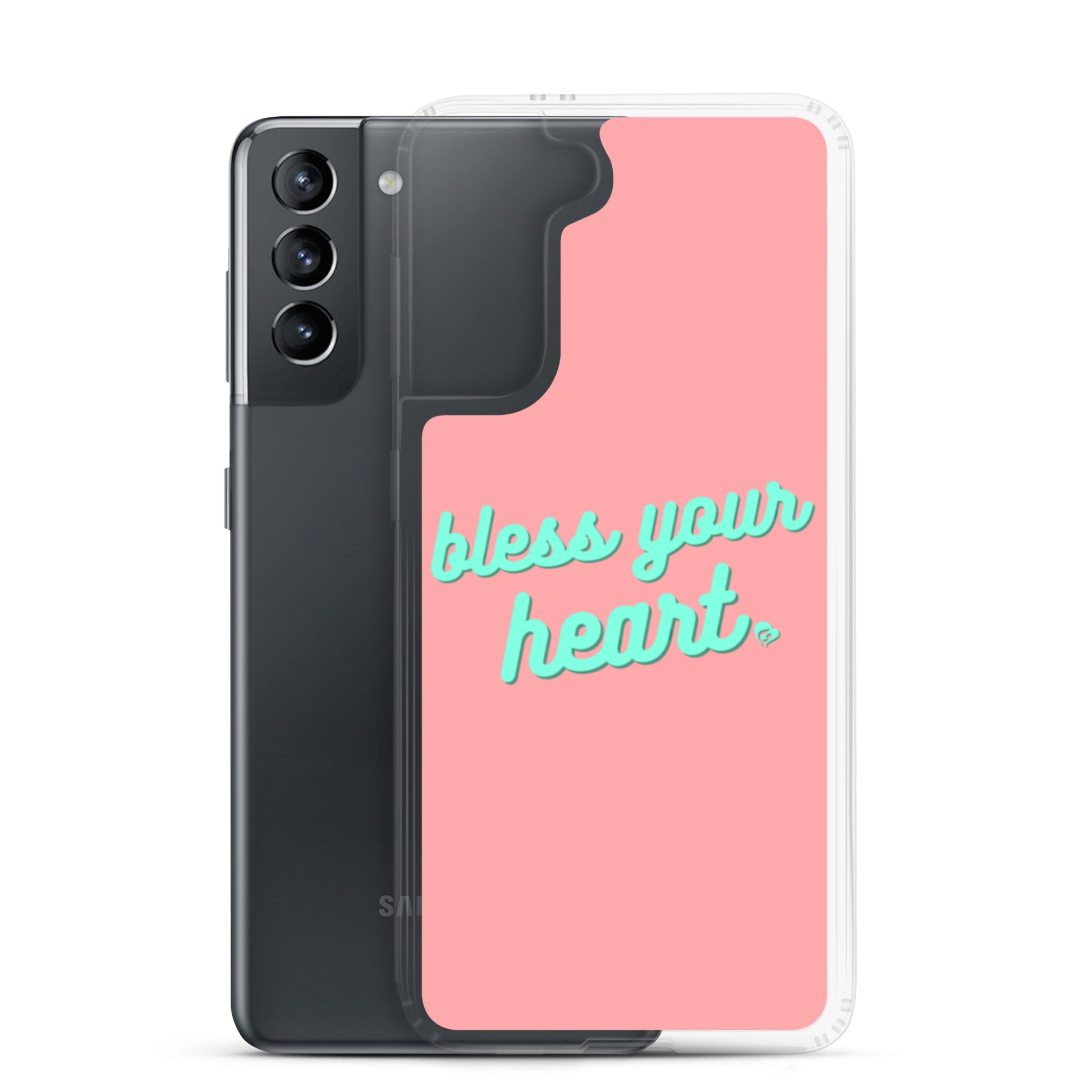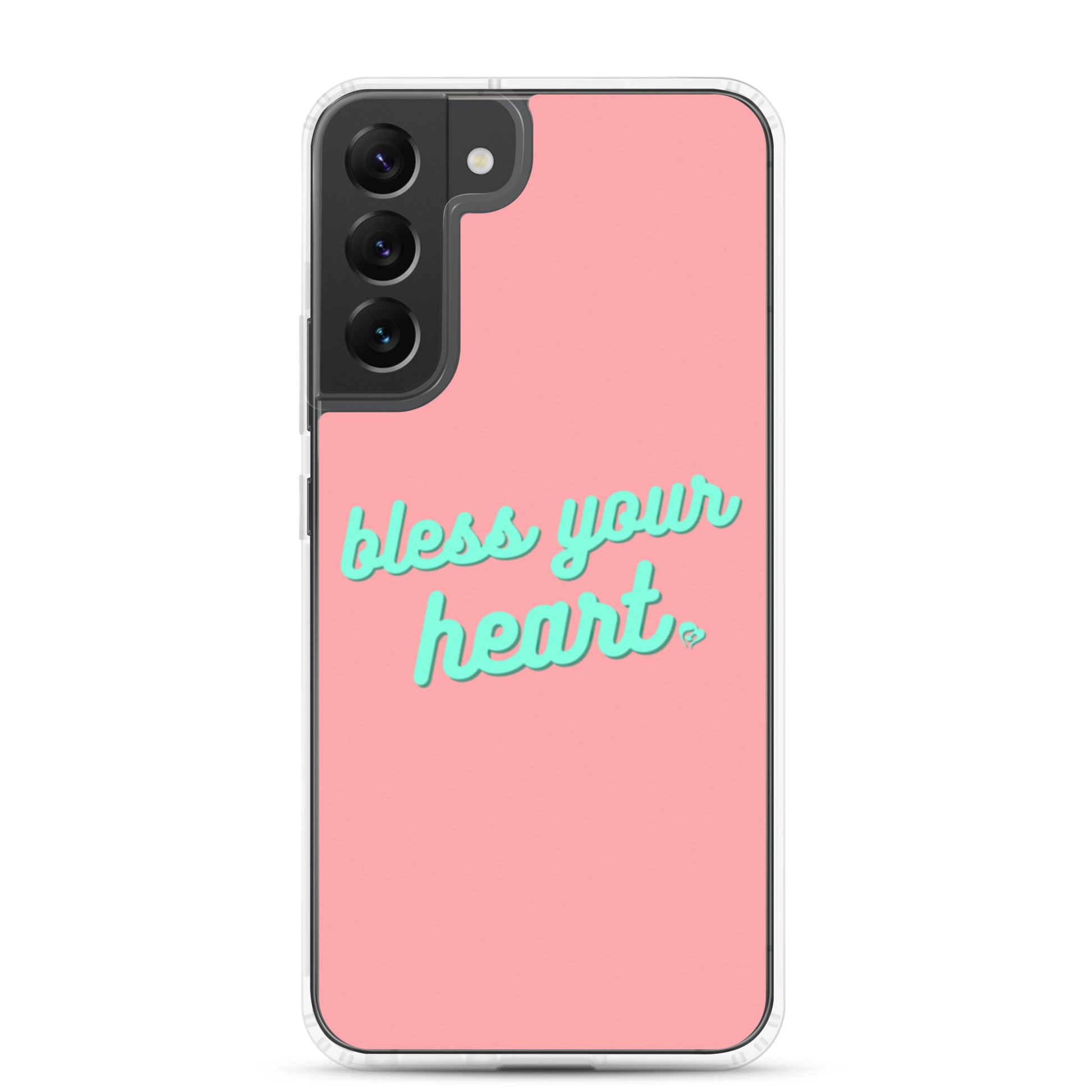 This sleek Samsung case protects your phone from scratches, dust, oil, and dirt. The bless your heart southern saying has a retro feel and really pops on the coral background. It has a solid back and flexible sides that make it easy to take on and off, with precisely aligned cuts and holes. It is a BPA-free hybrid thermoplastic polyurethane and polycarbonate material. Wireless charging capable.