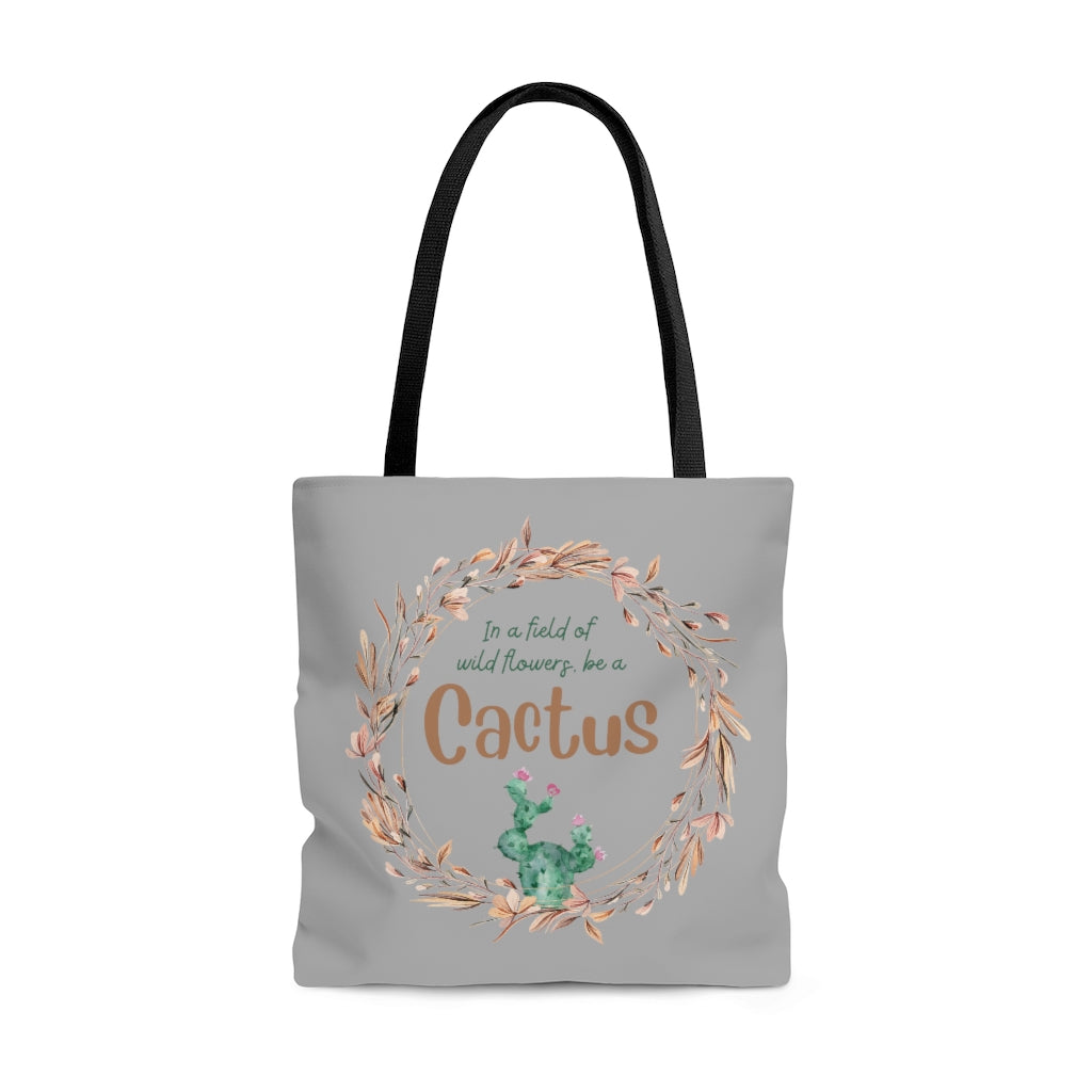 In a field of wildflowers, be a cactus. This practical, high-quality Tote Bag provides comfort with style at the beach or out on the town. Made from reliable materials, lasting for seasons. It is 100% polyester with black cotton handles. The large size will allow you to carry around all the things you need for a day.