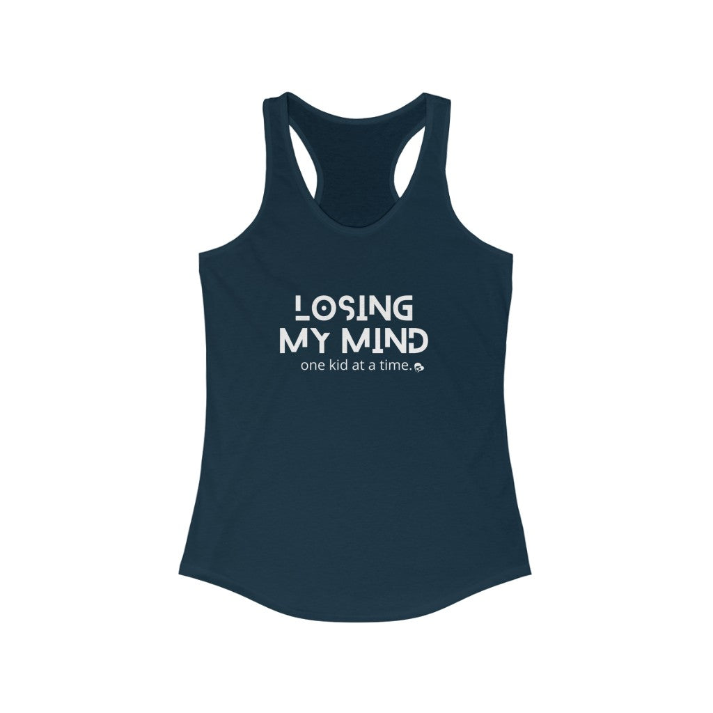 This racerback tank is a must-have for any mama. We're all losing our minds one kid at a time. The lightweight slim fit cut is flattering on any mom bod. This tank top does run smaller than usual, so size up for a loose fit.