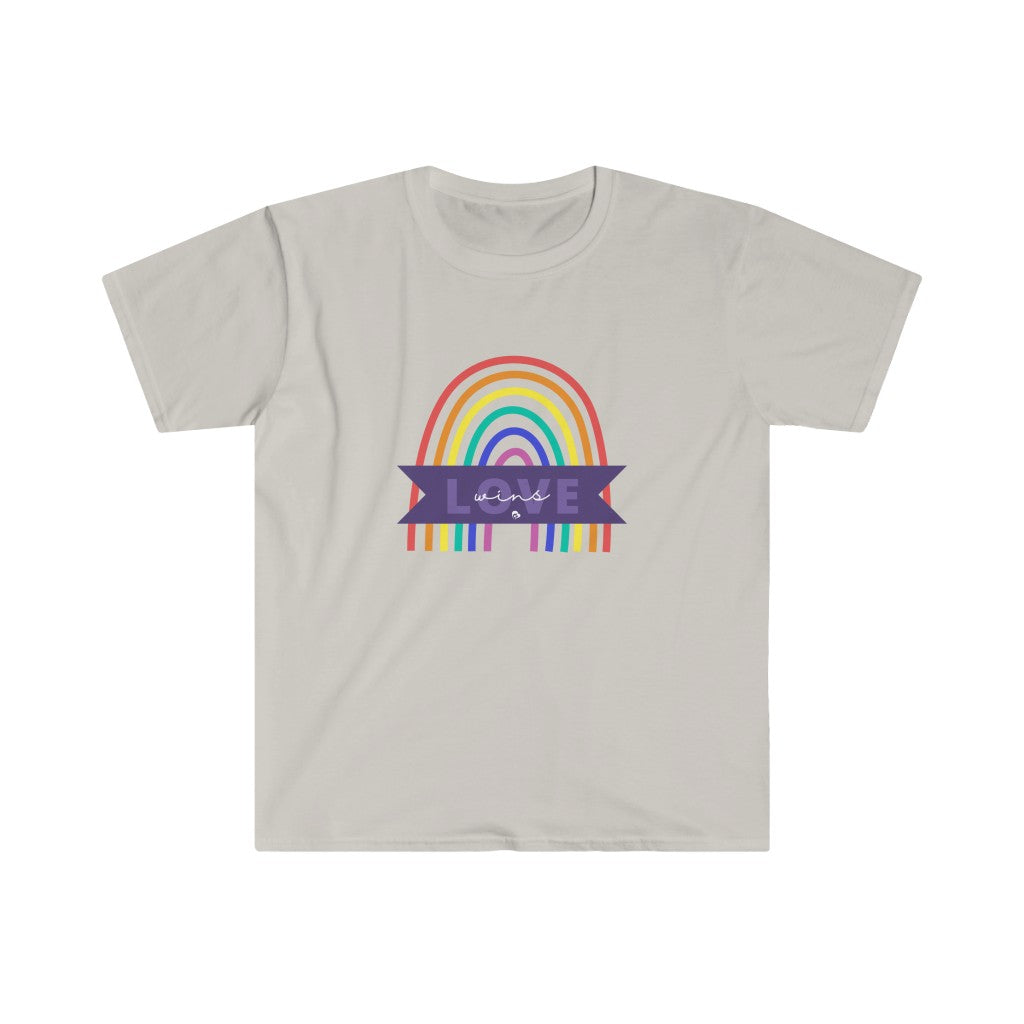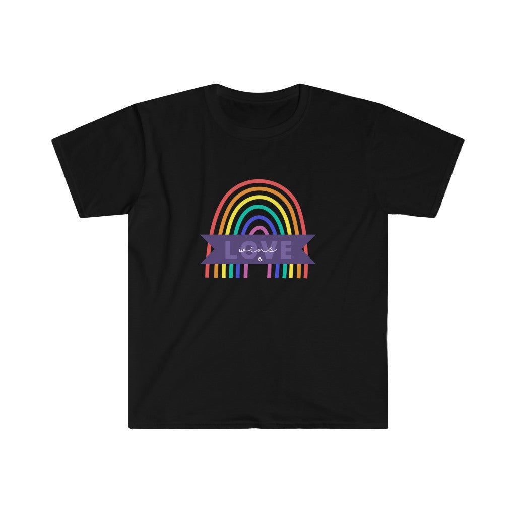 Show off your pride with this love wins tee. It is super soft and comfy, runs true to size, and has a tear-away label. The light fabric is 100% cotton, except for the heather purple which contains polyester. The rainbow graphic looks great on dark pink, black, gray, blue, and purple!
