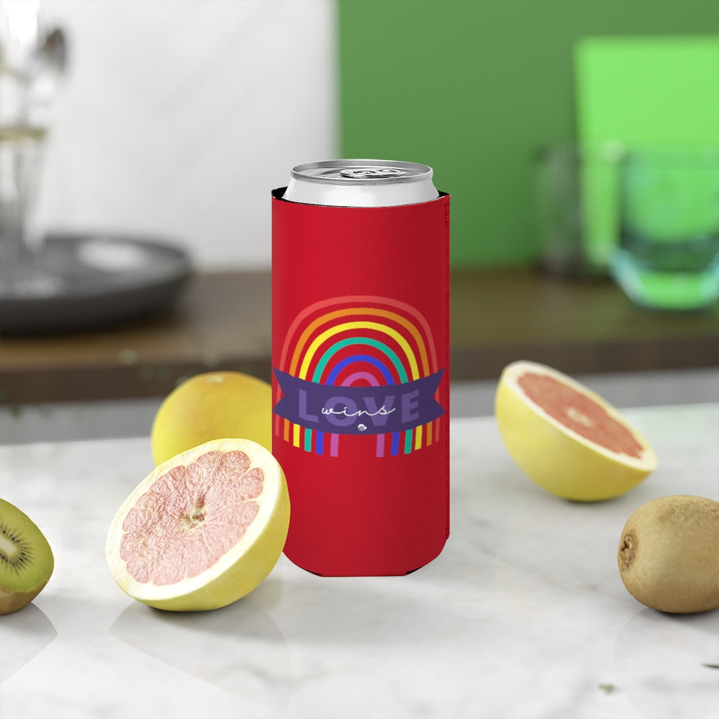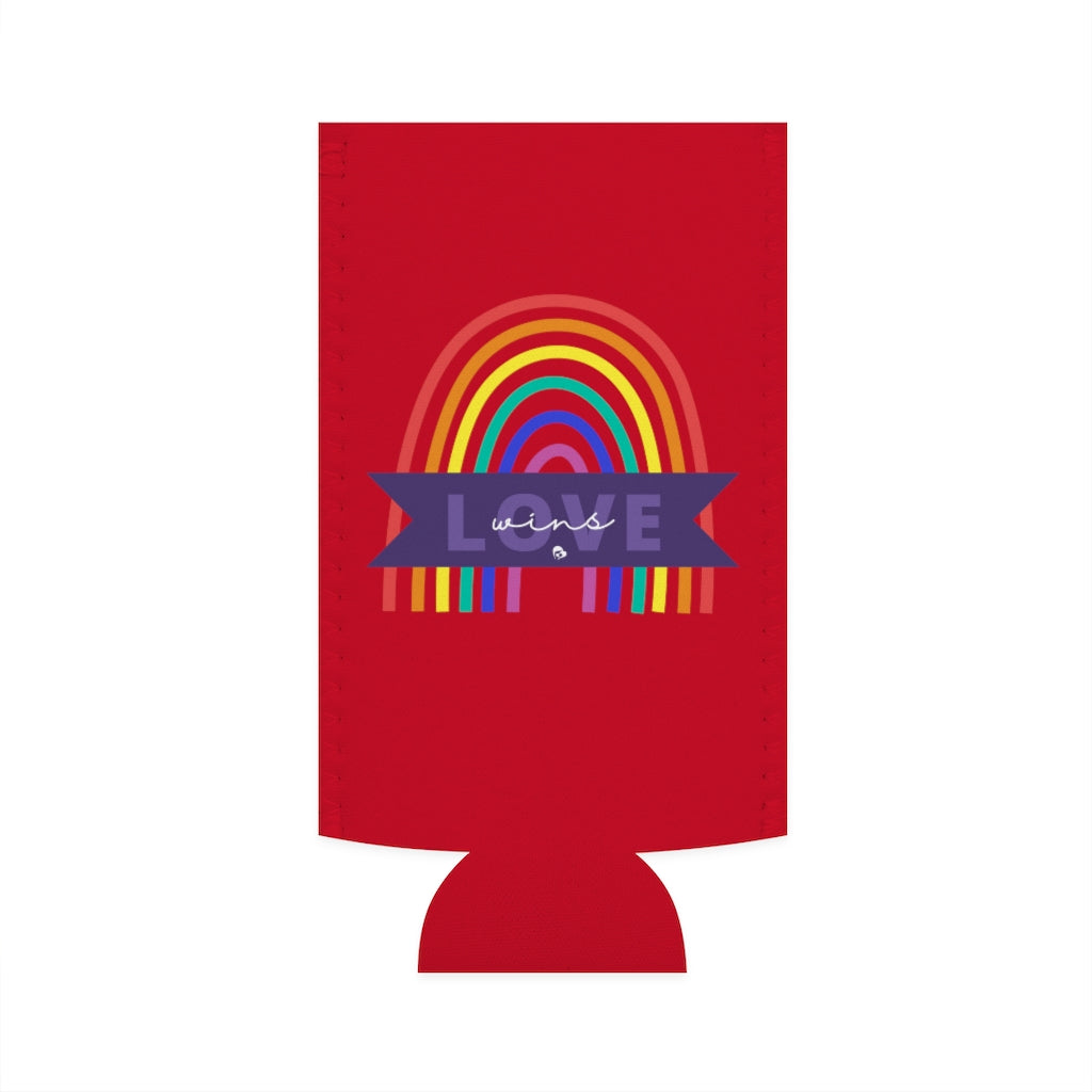 Love always wins. This red koozie features a rainbow with the statement love wins. Whether you want to show off your pride or show solidarity, this koozie is with you. This fits a standard slim 12oz can.