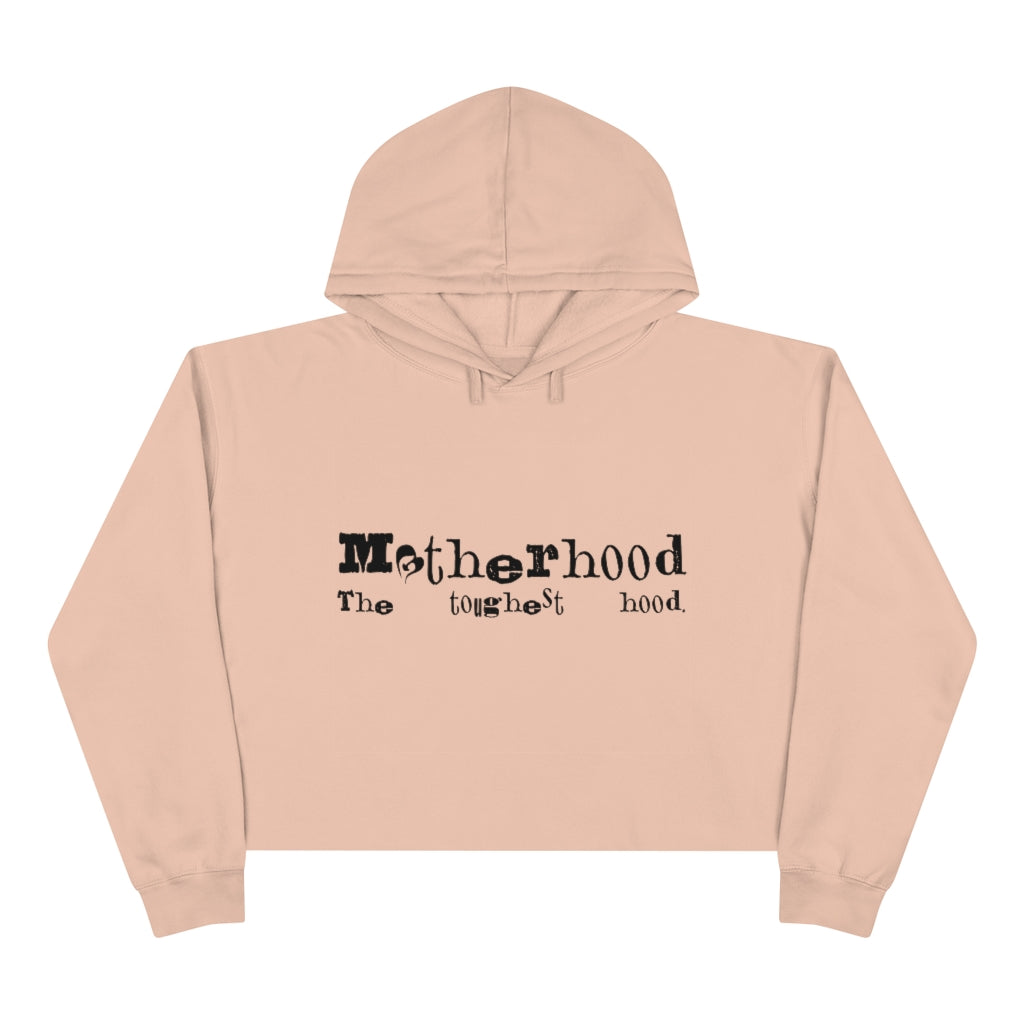 Motherhood is the toughest hood. No doubt about it. And this trendy crop hoodie will make you look great no matter what those kids are doing. The soft fleece is super comfy with tight-knit construction. It has a raw bottom hem and comes in light pink or white with black lettering. 85% cotton, 15% polyester.