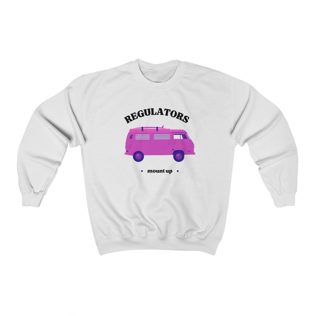 This sweatshirt is too much. It's retro design with the old school VW bus and Regulators Mount Up channel your inner hippie gangster. The sweatshirt itself is soft and cozy with fleece lining to keep you warm. It's 50% cotton/50% polyester blend runs true to size and offers a loose fit.
