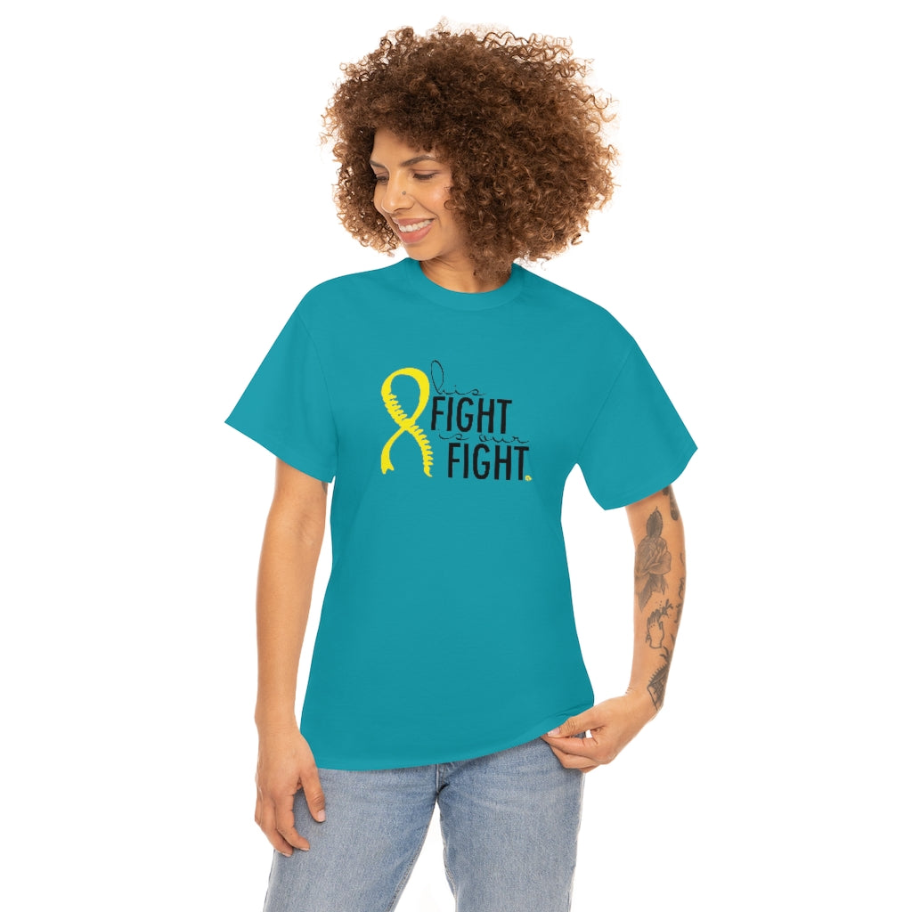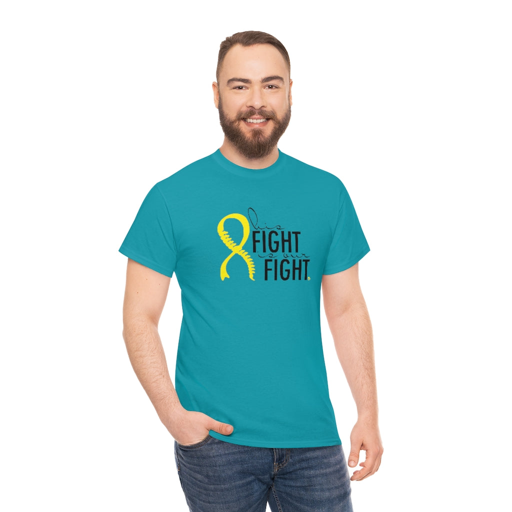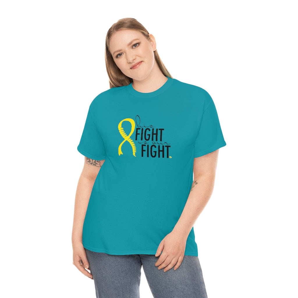 This is a very special shirt personalized with the yellow Spina Bifida ribbon and spine and features the words "his fight is our fight." This shirt was designed for our little Spina Bifida warrior, and all of the proceeds from sales will go directly to benefit the Ronald Mcdonald House Charities in Cincinnati, where we stayed during our prenatal care. This shirt is available in teal and ash. They are 100% cotton and medium weight. They run true to size.