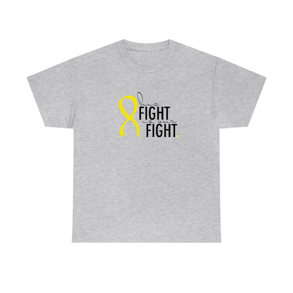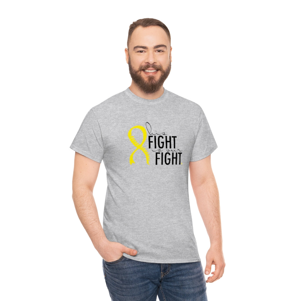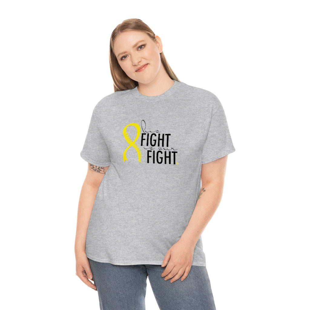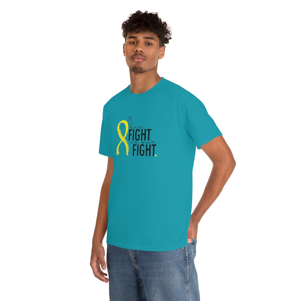 This is a very special shirt personalized with the yellow Spina Bifida ribbon and spine and features the words "his fight is our fight." This shirt was designed for our little Spina Bifida warrior, and all of the proceeds from sales will go directly to benefit the Ronald Mcdonald House Charities in Cincinnati, where we stayed during our prenatal care. This shirt is available in teal and ash. They are 100% cotton and medium weight. They run true to size.